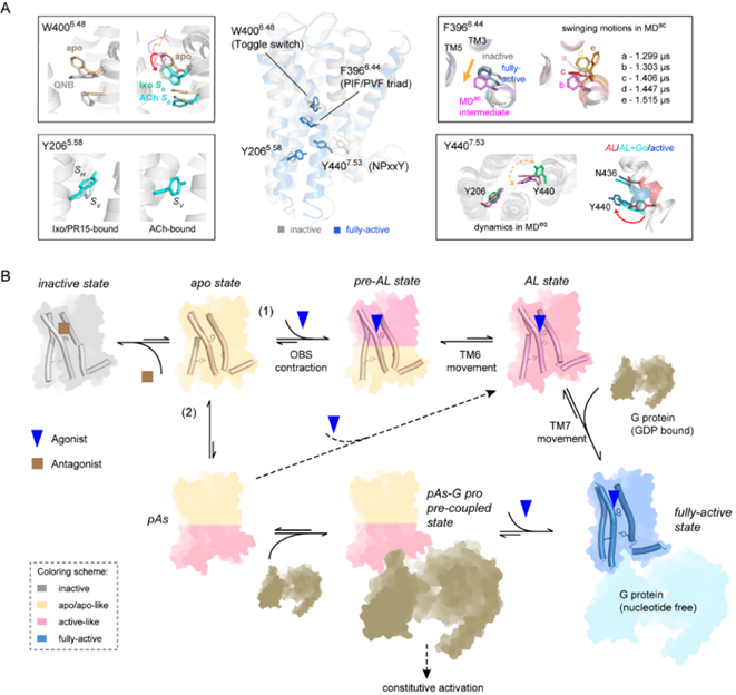 该研究成果完整揭示了受体构象变化的时序/动态过程,突破了传统“两态模型(非激活/激活)”的理论框架,表明M2R激活存在多步骤动态路径的重要特征。更重要的是发现不同配体的结合以动态变化的形式编码储存在芳香环的运动中。该发现为基于动力学的靶向药物设计给予了全新视角。